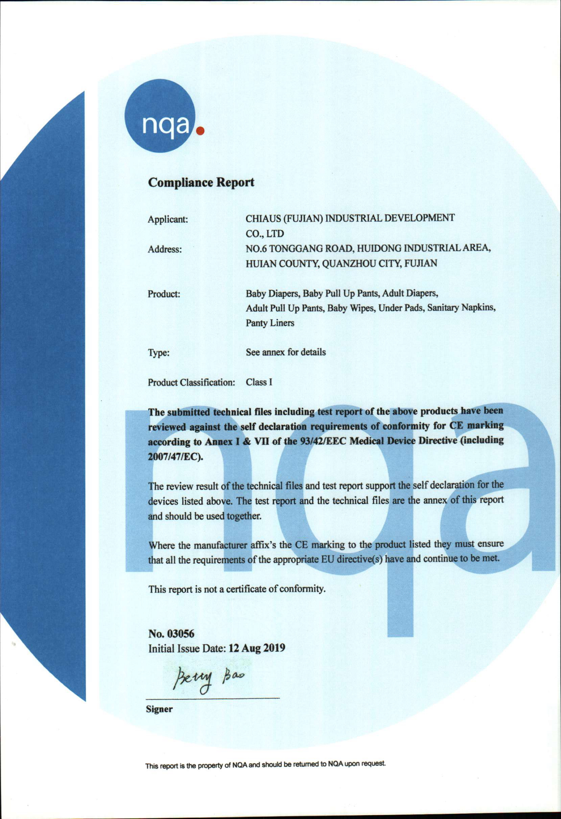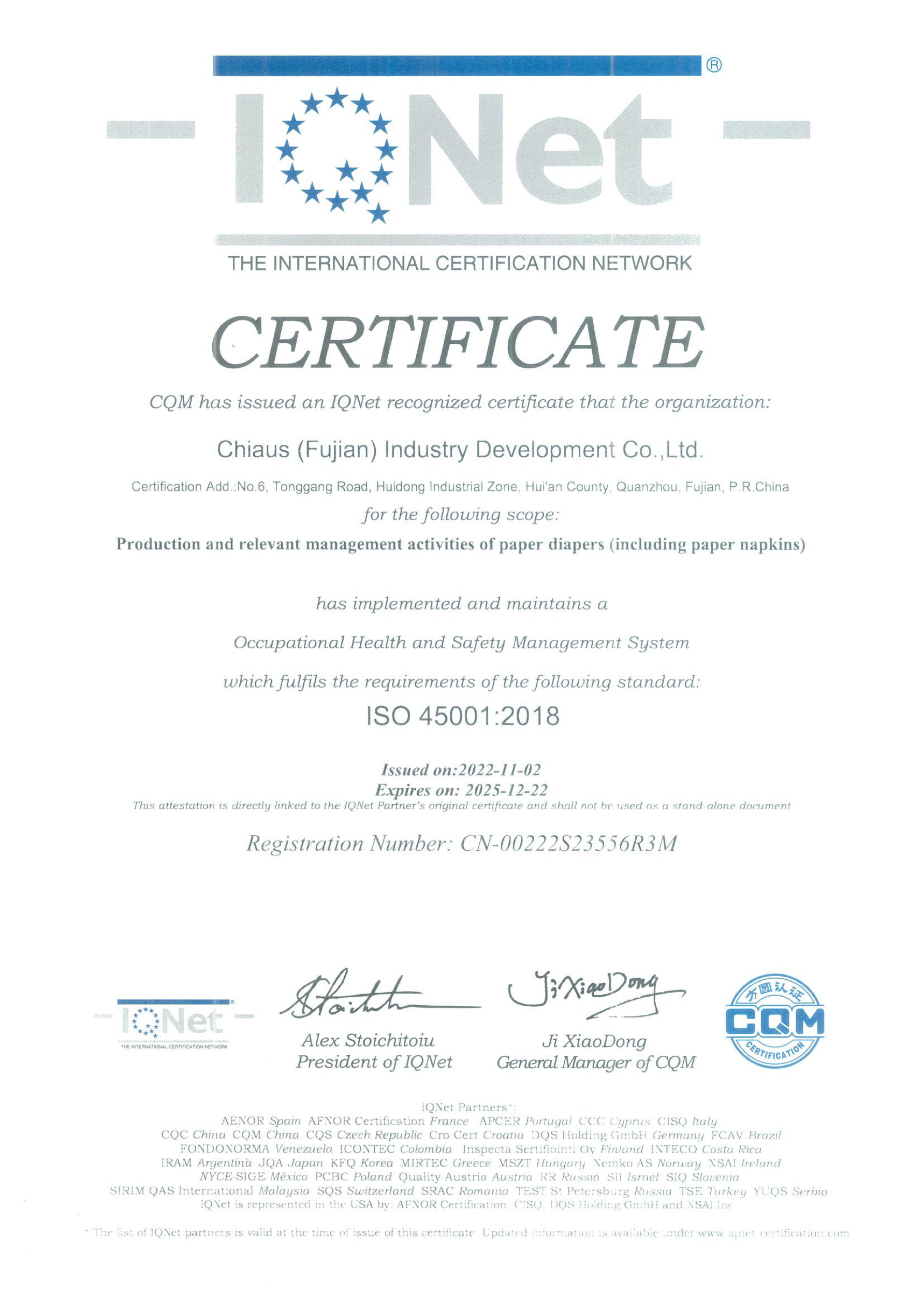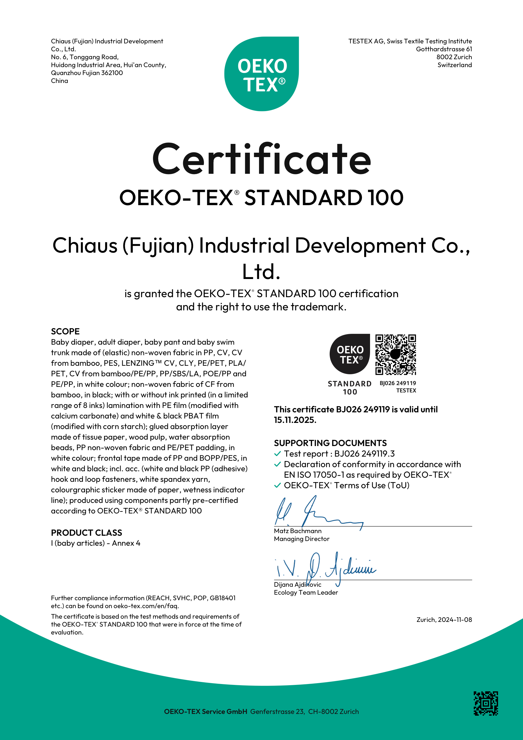 At Chiaus, we are committed to maintaining the highest standards of quality and safety in the production of our diapers. Our certifications reflect this dedication, demonstrating our adherence to international standards and our ongoing pursuit of excellence.