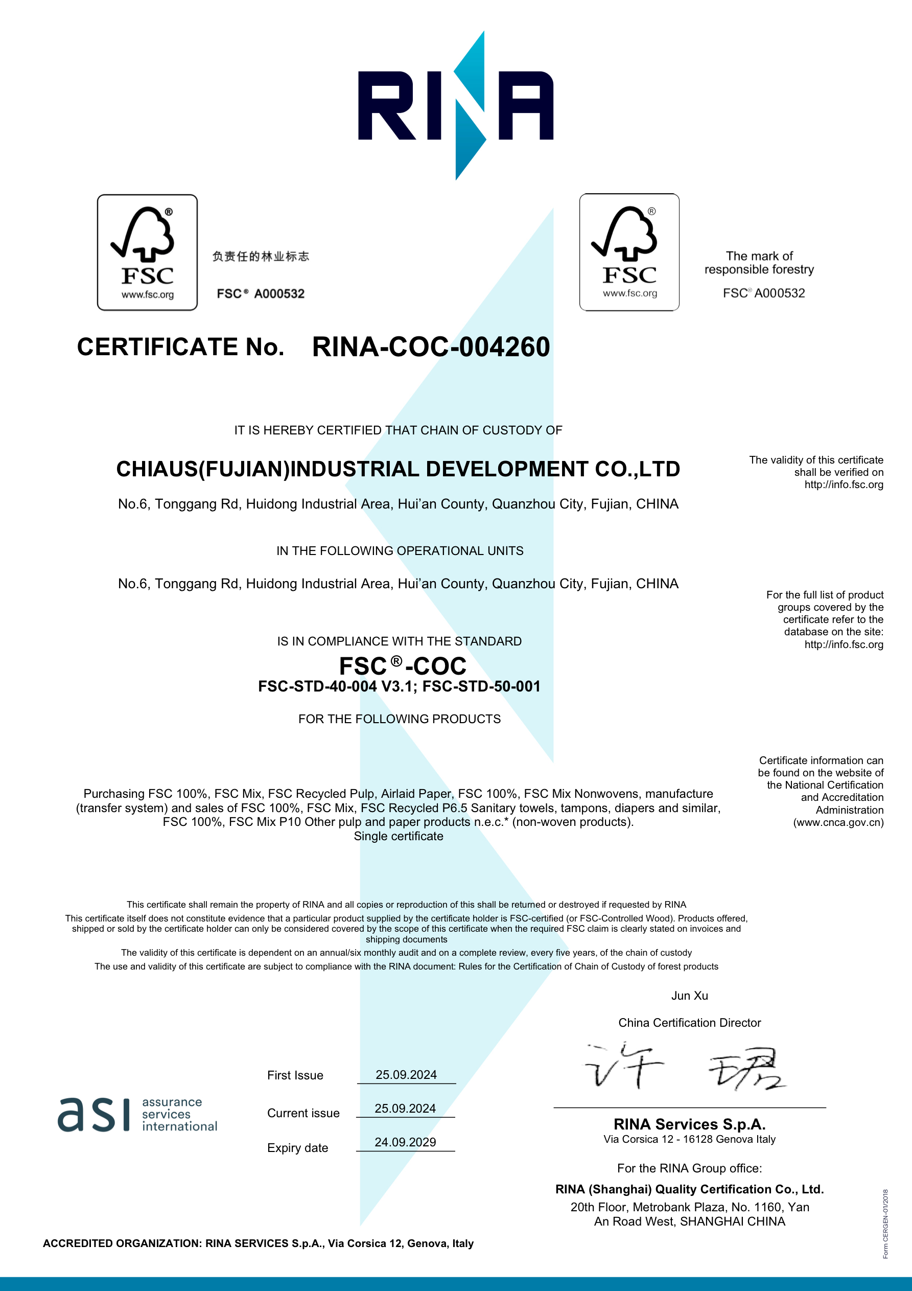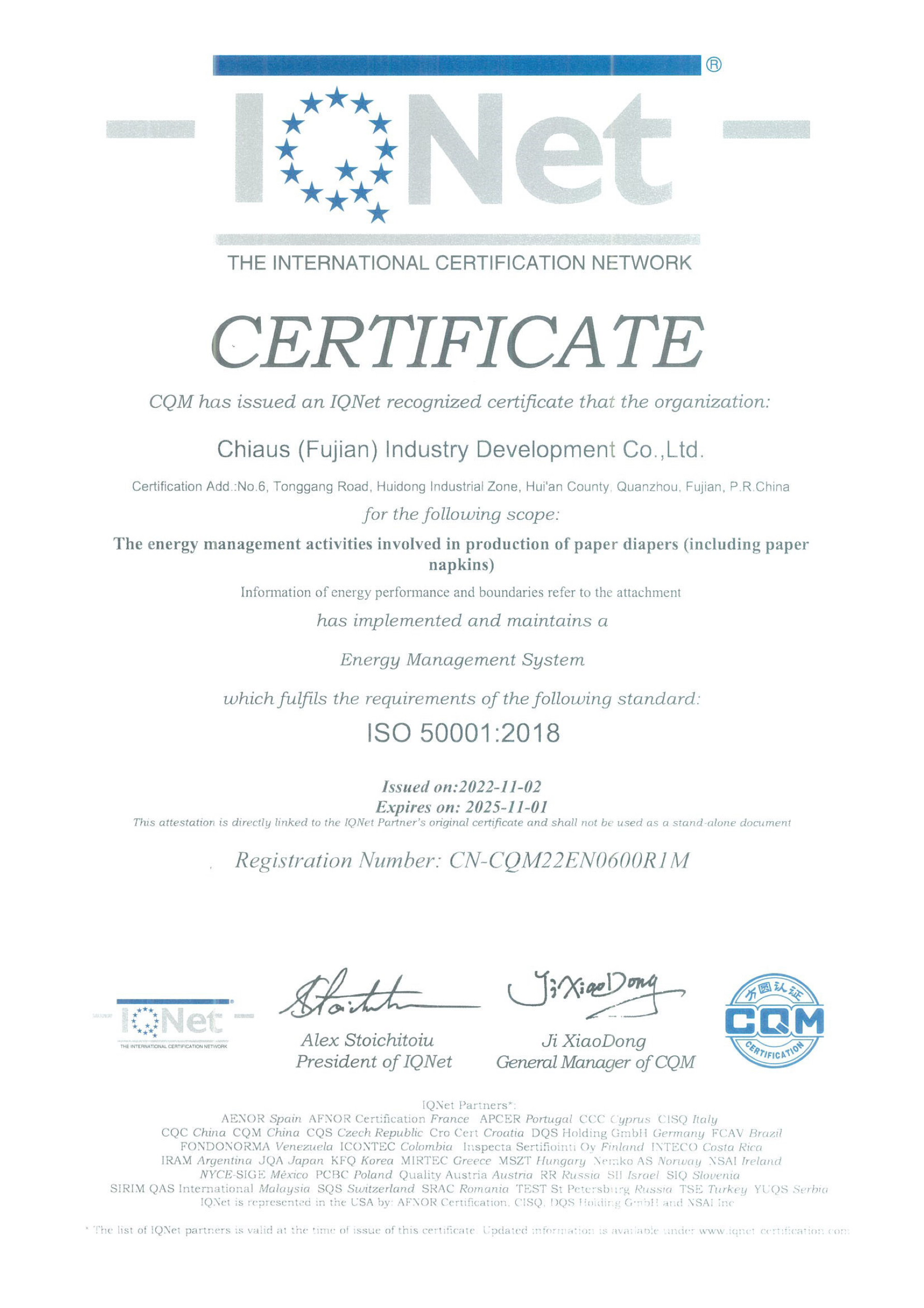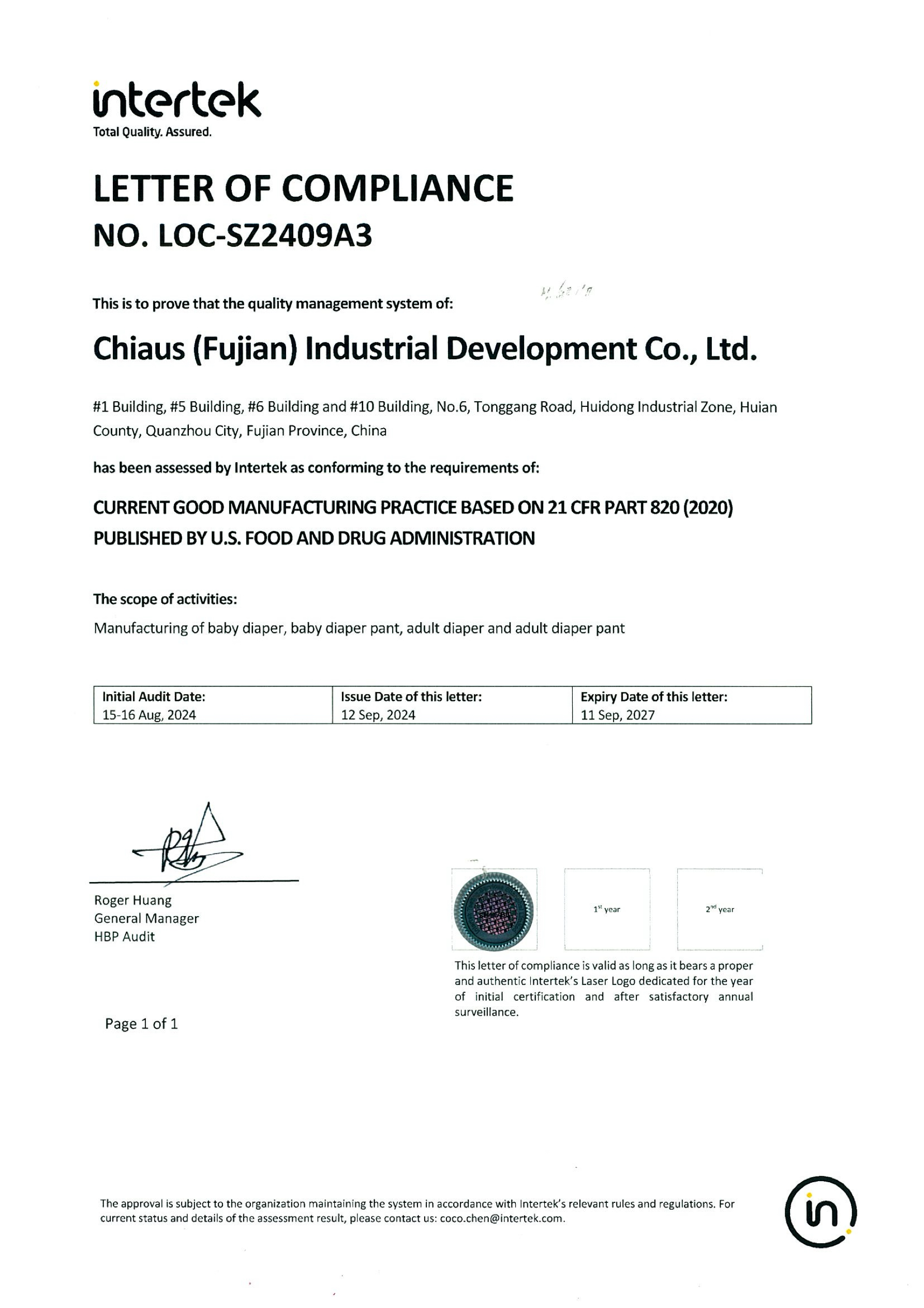 At Chiaus, we are committed to maintaining the highest standards of quality and safety in the production of our diapers. Our certifications reflect this dedication, demonstrating our adherence to international standards and our ongoing pursuit of excellence.